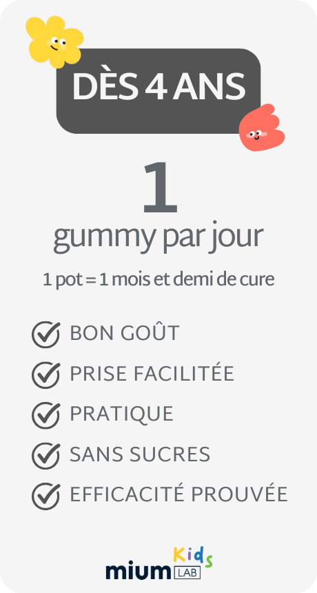 dès 4 ans sans sucresGummies EnfantsCure de multivitamines pour l'équilibre des enfants en pleine croissance. Formule sans sucres.